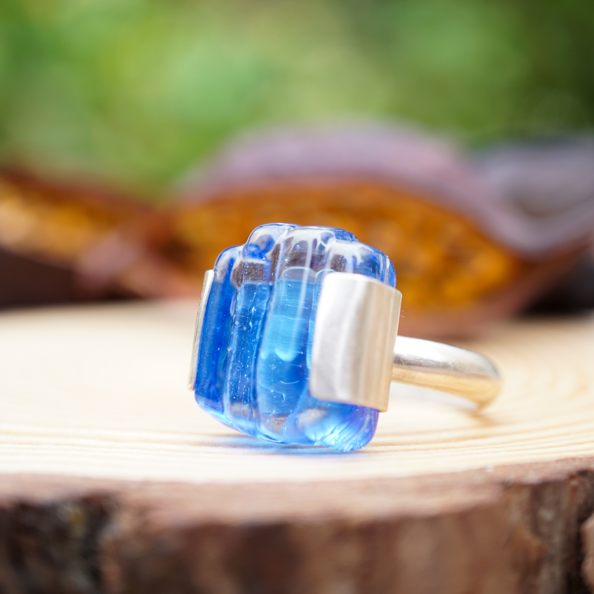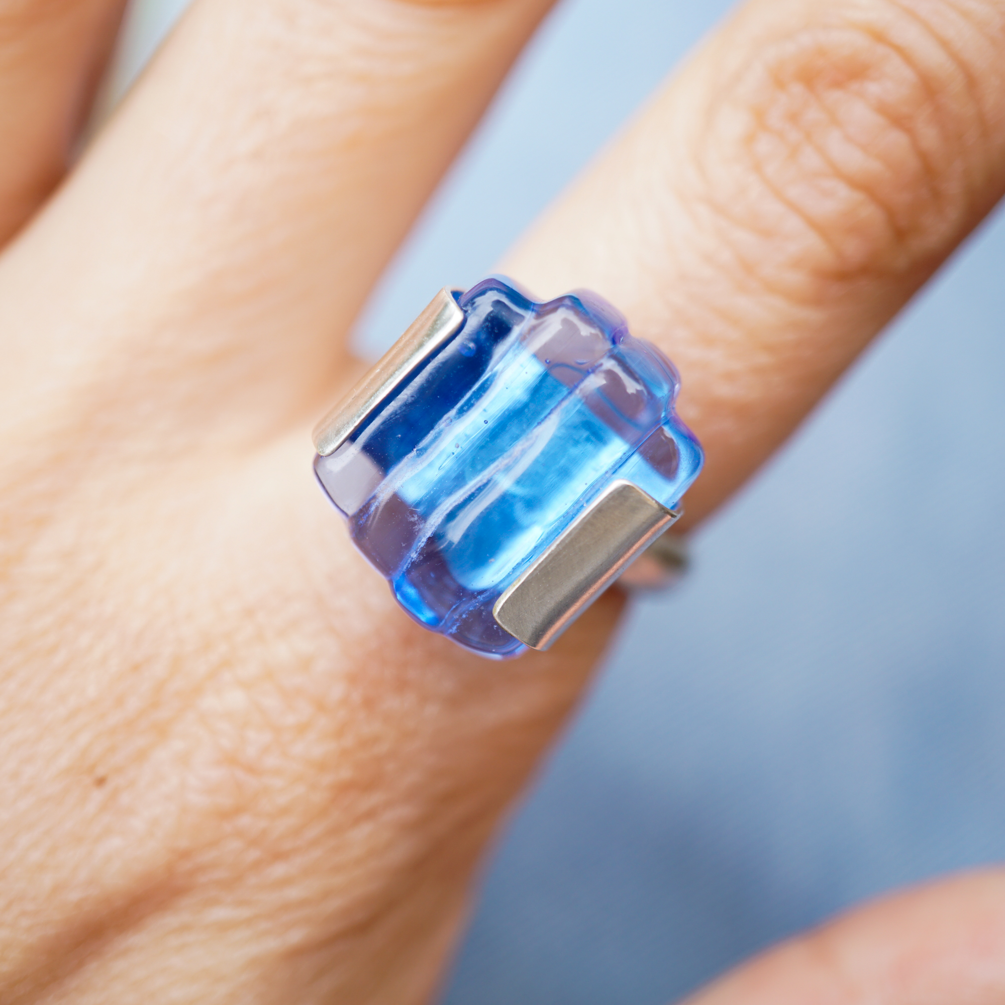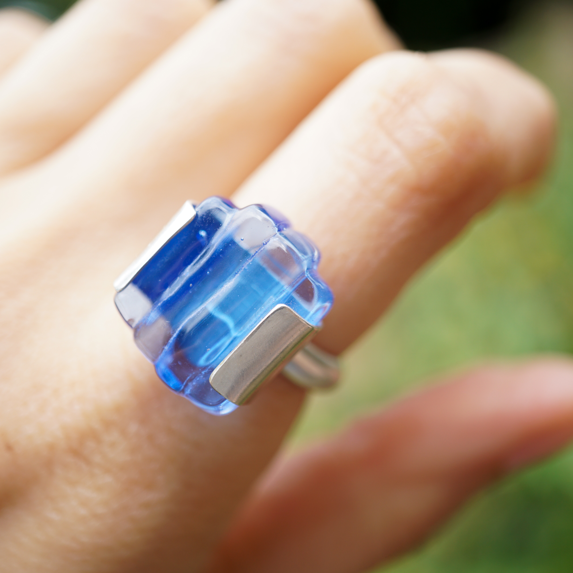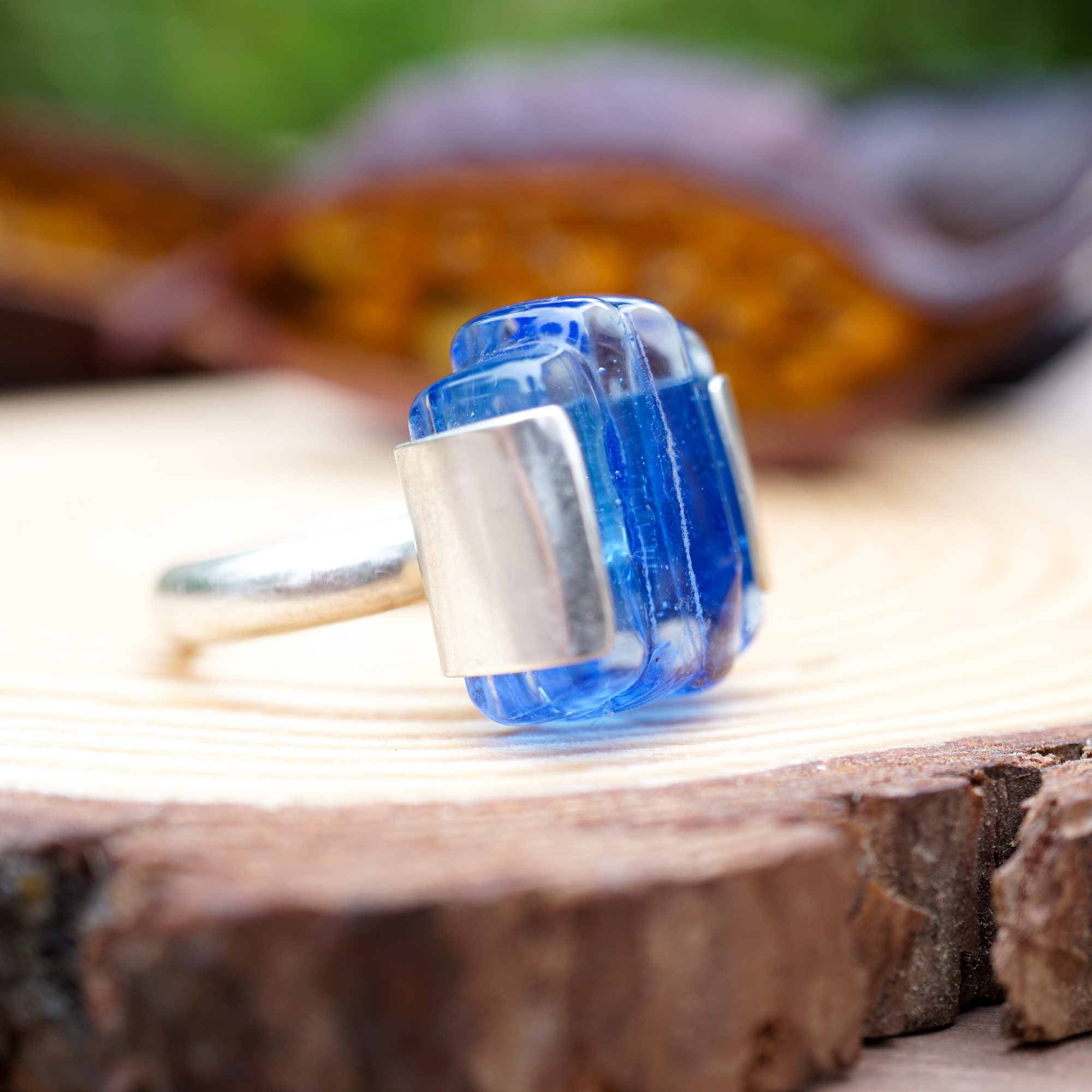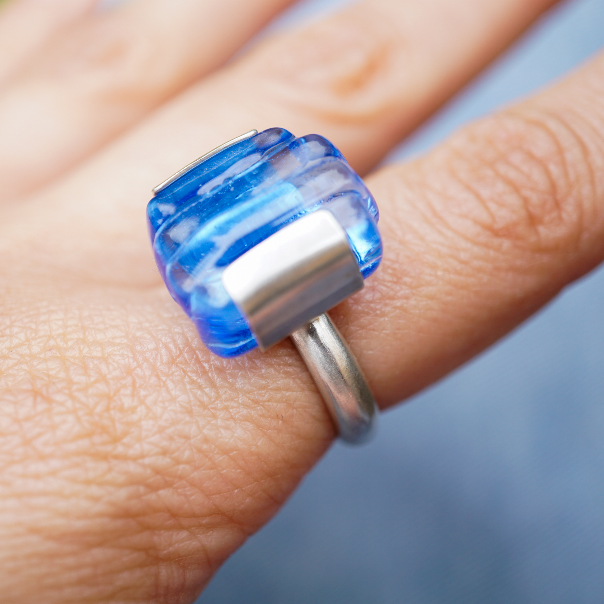 I had a desire some time ago to make some chunky glass rings that played with light at different depths and proceeded to cut and fire the glass components in the kiln using my favourite glass colours. The next stage was the silver, and as I wanted a professional finish I called upon my talented friend Susannah, of Susannah Brookes Jewellery, who thankfully was very enthusiastic to take on the challenge. She took the glass away and experimented with different designs to encapsulate the glass in a way that would allow light to shine through and make the glass glow. The end results are better than I ever imagined and I am thrilled to share these pieces with you all.